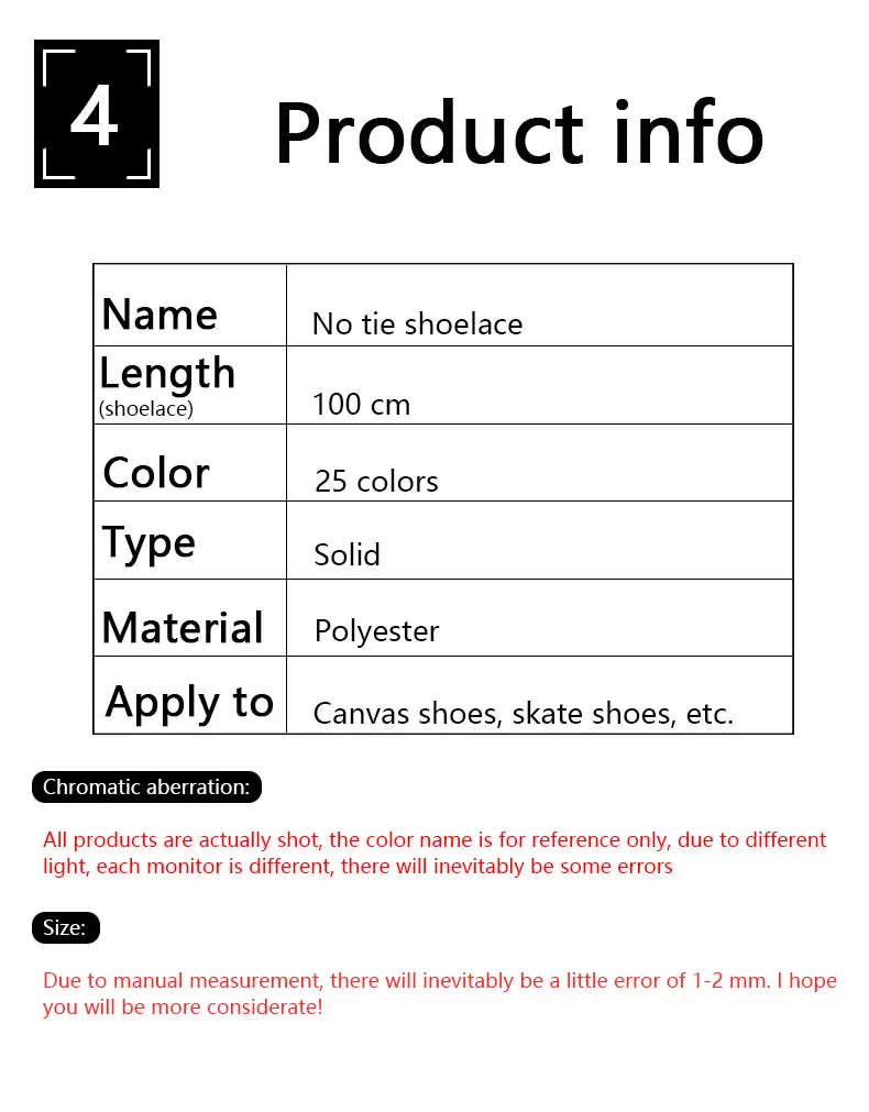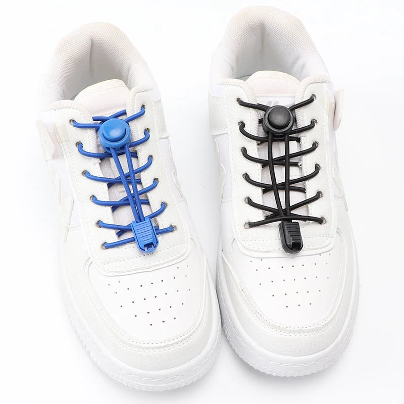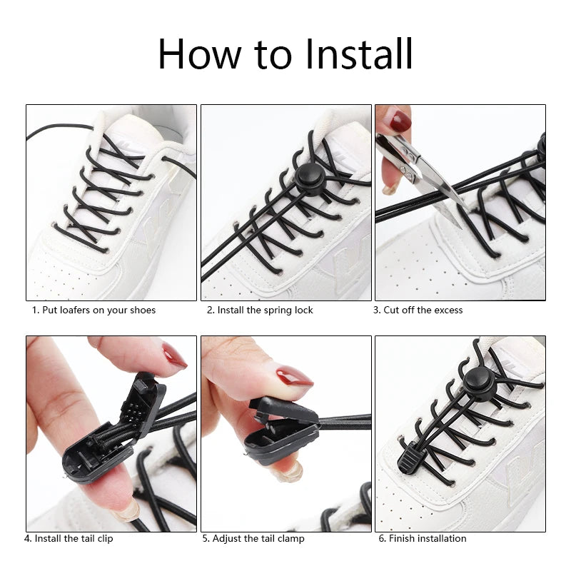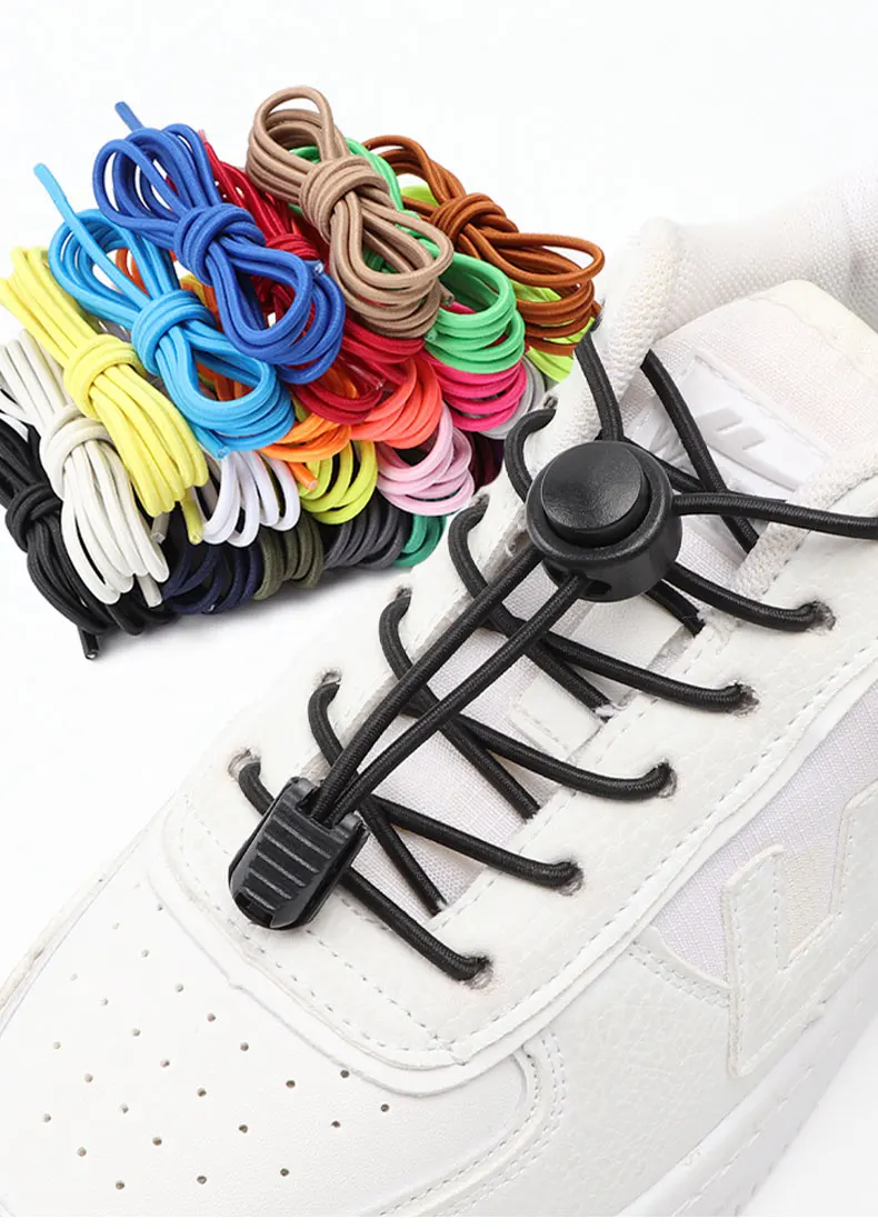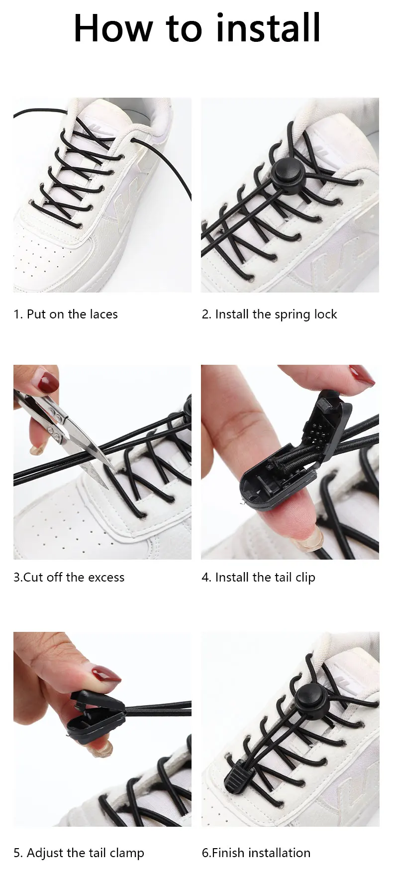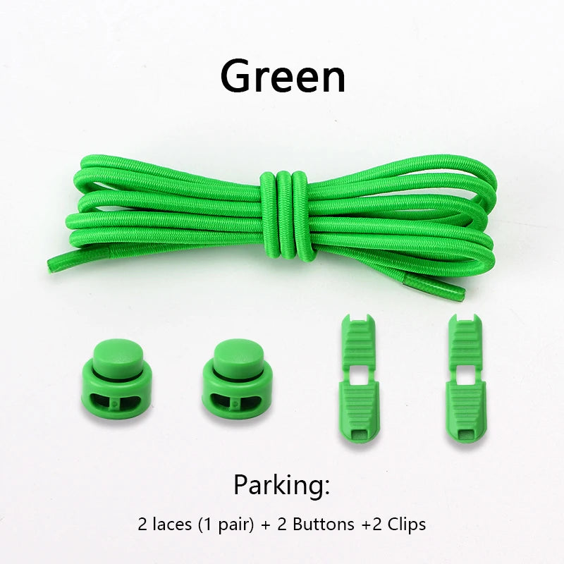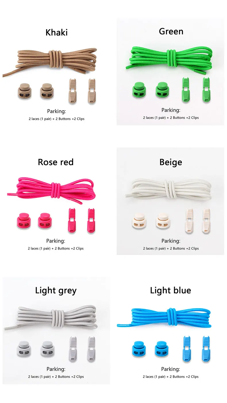 Packaging includes: rubber band shoelaces x 2, circular spring buckles x 2, tail clips x 2
